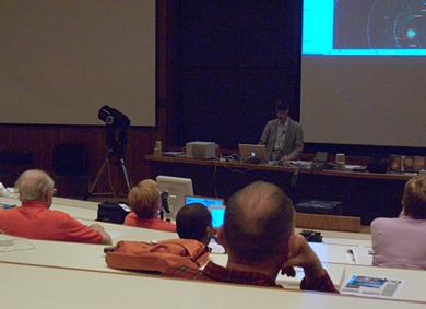 Toward the end of the demonstration, a telescope was activated, and it followed commands from the computer as it might outdoors. The program and telescope track together, so that what is seen in the eyepiece can be compared with what is on the sky map, or one can select an object on the map and immediately see it in the telescope.