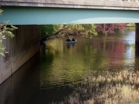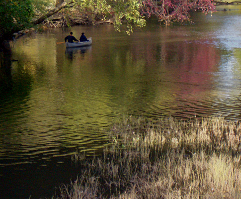 The arrow on the map is the canoe, which was floating just north of the Route 27 bridge. I was standing on the smaller bridge near the old mill, shooting a rapid series in order to catch the canoe before it disappeared. Careful cropping later removed the bridge and transformed an ordinary snapshot into an attraction. On the satellite photogaph, look to the right and find an even smaller bridge in the woods. The bowed trees, below, are just south of that little bridge.