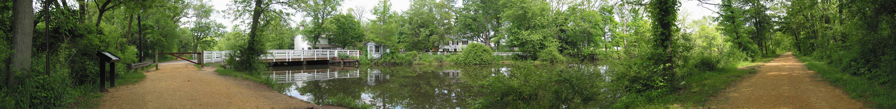 As if a barge being pulled upstream, you are invited to scroll slowly right to follow this panorama of Blackwells Mills. Notice the small structure overhanging the water, probably where the bridge tender sat and waited for the next horse and carriage that would require a crossing.