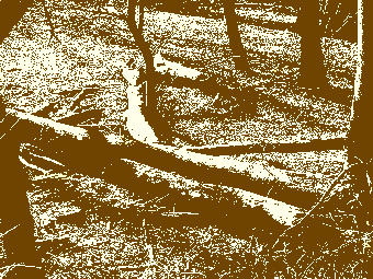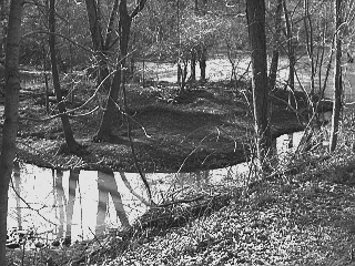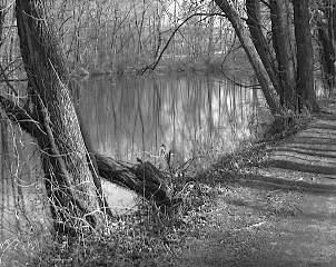 The Millstone River was active from recent rain that has eased last summer's drought, and the sun danced busily on distant ripples, while a nearby pond lazily reflected the trunks of randomly-leaning trees. A few years ago, a massive ice flow felled many trees along the entire river, and their decaying remains (very important to wildlife, by the way) created a jumbled pattern on the moist ground, in this high-contrast rendition, below.